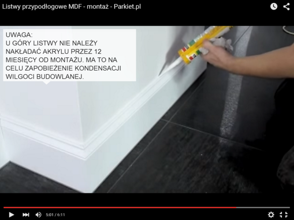 - Nakładanie akrylu: jednym ciągłym ruchem nałóż biały akryl w szczelinę między listwą a ścianą; wygładź łączenie zwilżonym palcem, eliminując pęcherzyki i nierówności.