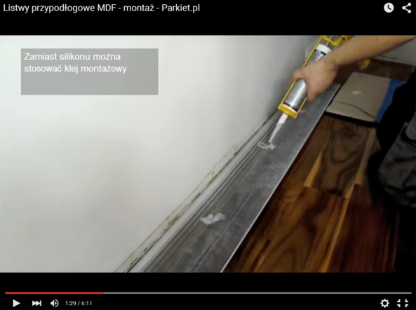 - Nakładanie kleju montażowego: nanieś klej do listew we wgłębieniu listwy równomiernie w odstępach 30–50 cm, aby zapewnić równomierne przyleganie na całej długości.