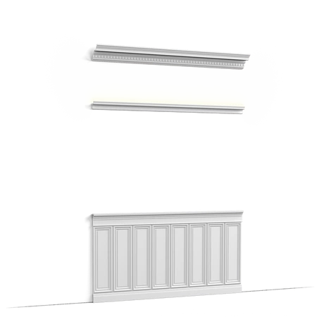 - Kolekcja Burlington (Refined) elegancka aranżacja ściany łącząca klasyczną symetrię z nowoczesną fakturą paneli 3D, uzupełniona gzymsami, listwami dekoracyjnymi i przypodłogowymi dla harmonijnego wykończenia wnętrza.