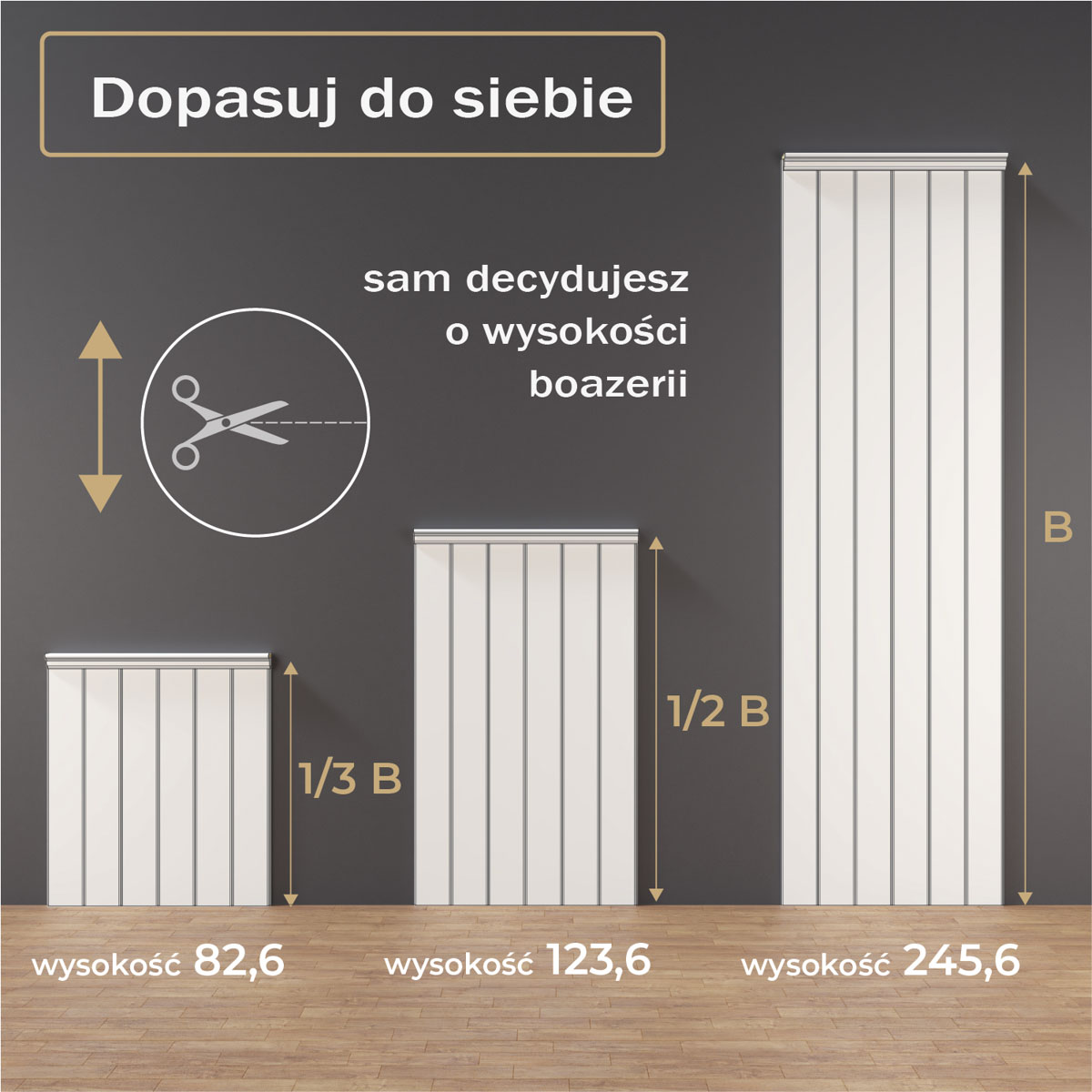 Listwę środkową należy rozciąć we własnym zakresie na 3 równe części o długości 81 cm. Po złożeniu cała boazeria ma wysokość 82,6 cm oraz długość 225 cm