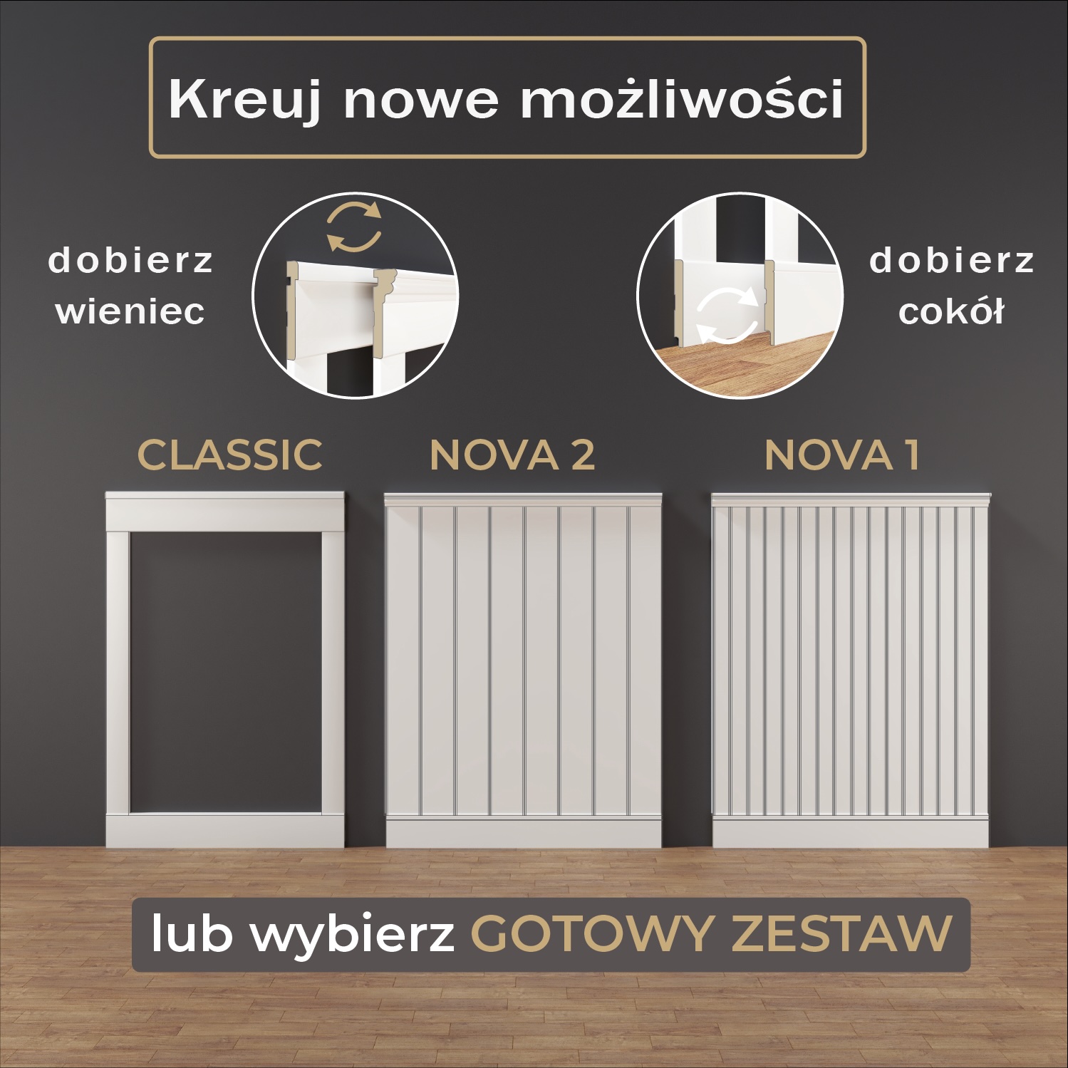 - Boazeria angielska NOVA to eleganckie panele MDF, gotowe do malowania, które doskonale wkomponują się w każde wnętrze, gwarantując trwałość i estetykę przez długie lata.