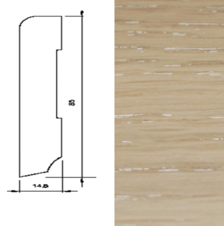 - Listwa przypodłogowa dąb cream to stylowe wykończenie wnętrza z naturalnym fornirem na rdzeniu z drewna iglastego. Lakierowana powłoka zapewnia odporność na zabrudzenia i długotrwały, estetyczny wygląd.