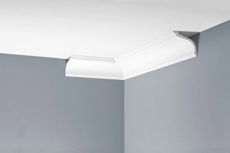 - Listwa gzymsowa Creativa LGG-05, wykonana z twardego i lekkiego poliuretanu, odporna na wilgoć i zmywanie, idealna do nowoczesnych wnętrz, o wymiarach 105x95mm i długości 240cm.