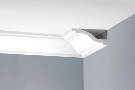 - Listwa gzymsowa LGG 10 Creativa o wymiarach 55x135 mm i długości 240 cm, wykonana z lekkiego, twardego i odpornego na wilgoć poliuretanu, gotowa do malowania dowolnymi farbami wodnymi.