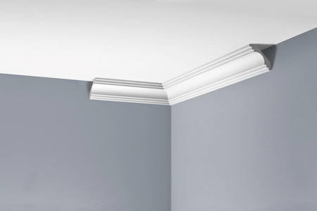- Listwa gzymsowa Creativa LGG 17, wykonana z twardego, lekkiego i odpornego na wilgoć poliuretanu, o wymiarach 70x70mm i długości 240cm, gotowa do malowania dowolnymi farbami wodnymi.