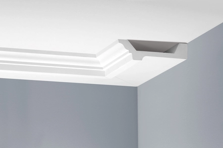 - Listwa gzymsowa sufitowa Creativa LGG-26, wykonana z lekkiego, twardego i wilgociodpornego poliuretanu, pomalowana farbą podkładową, idealna do powiększania innych wzorów.