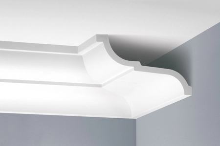 - Listwa sufitowa Creativa LGG 31, wykonana z twardego, lekkiego i odpornego na wilgoć poliuretanu spienionego, o wymiarach 210x130mm i długości 240cm, gotowa do malowania dowolnymi farbami wodnymi.
