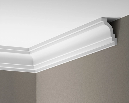 - Listwa sufitowa Creativa LGG-44, wykonana z lekkiego i twardego poliuretanu, odporna na wilgoć i zmywanie, z gładką, satynową fakturą, gotowa do malowania. Wymiary: 77x54mm, długość 244cm.