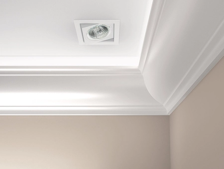 - Listwa oświetleniowa przysufitowa Creativa LOC 04, wykonana z utwardzonego polistyrenu, o gładkiej, satynowej fakturze, odporna na wilgoć i zmywanie, niepalna i nietoksyczna, o wymiarach 106x108 mm i długości 244 cm.