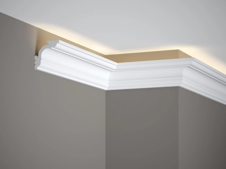 Listwa oświetleniowa MD106 to elegancki element sztukaterii, który doda blasku każdemu pomieszczeniu. Wykonana z wytrzymałego materiału PolyForce, jest odporna na uszkodzenia mechaniczne. Dzięki zastosowaniu technologii LightGuard®, zapobiega nieestetycznemu prześwitywaniu diod przez materiał, subtelnie oświetlając pomieszczenie. Listwa jest również odporna na działanie wody i promieni słonecznych, dzięki czemu zachowuje swój wygląd przez wiele lat.Przykłady zastosowania listwy oświetleniowej MD106
