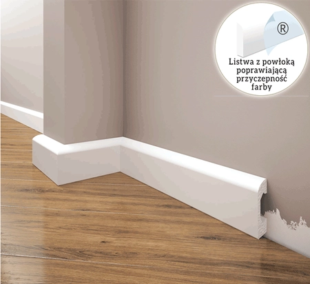 - Listwa przypodłogowa Creativa LPC-04, wykonana z utwardzonego polistyrenu, jest lekka, twarda, odporna na wilgoć i zmywanie, nietoksyczna, gotowa do malowania dowolnymi farbami wodnymi.