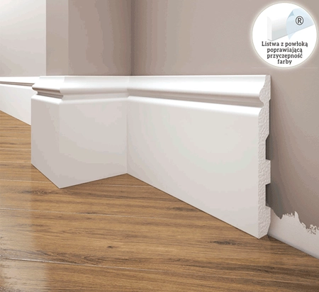 Listwa przypodłogowa Creativa LPC-24 sprawdzi się idealnie jako cokół podłogowy w każdym pomieszczeniu. Można ją malować dowolnymi farbami wodnymi, co pozwala na idealne dopasowanie do kolorystyki wnętrza. Dzięki swojej odporności na wilgoć, jest również doskonałym wyborem do łazienki czy kuchni.