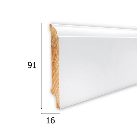 - Listwa przypodłogowa biała, wzór AGAT 91, wykonana z lakierowanego drewna iglastego, o wymiarach 91mm x 16mm x 2400mm, z wykończeniem półmatowym 28 Gloss, dostępna w dowolnym kolorze z palety RAL lub NCS.