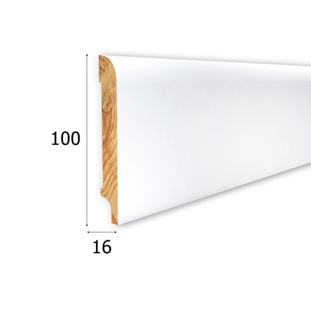 - Listwa przypodłogowa z drewna iglastego, lakierowana na biało (RAL 9003), o wymiarach 100mm x 16mm x 2400mm, z wykończeniem półmatowym (28 Gloss). Możliwość zamówienia w dowolnym kolorze z palety RAL lub NCS.
