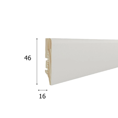 - Listwa przypodłogowa biała, drewno iglaste, lakierowana półmatowym lakierem RAL 9010, o wymiarach 46mm x 16mm x 2200mm, gotowa do montażu.