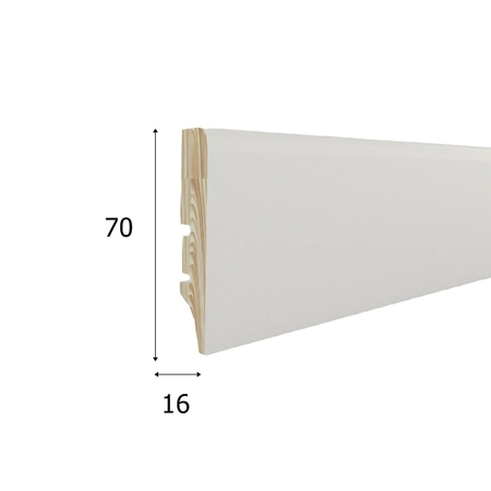 - Listwa przypodłogowa biała PW70, wykonana z lakierowanego drewna iglastego, o wymiarach 70mm x 16mm x 2200mm, wykończona półmatowym lakierem RAL 9010 o połysku 28 Gloss.