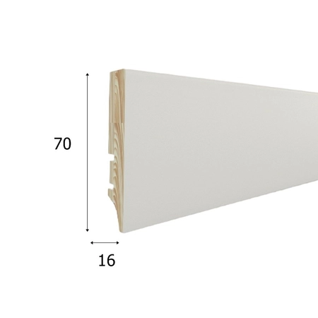 - Listwa przypodłogowa biała PW7C, wykonana z lakierowanego drewna iglastego, o wymiarach 70mm x 16mm x 2200mm, z wykończeniem półmatowym RAL 9010 o 28 Gloss.