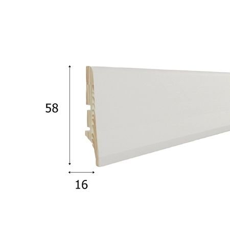 - Listwa przypodłogowa biała PW58, wykonana z lakierowanego drewna iglastego, o wymiarach 58mm x 16mm x 2200mm, z wykończeniem półmatowym 28 Gloss.