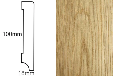 - Listwa przypodłogowa fornirowana, dąb, lakierowana, o wymiarach 100mm x 18mm x 2400mm, gotowa do montażu, z wykończeniem w połysku 30 Gloss.