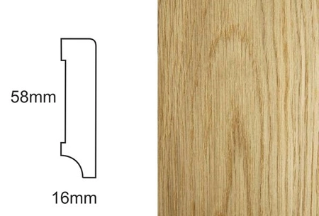 - Listwa przypodłogowa fornirowana, dąb, lakierowana wzorem CP58, o wymiarach 58mm x 16mm x 2400mm, gotowa do montażu, z wykończeniem w połysku 30 Gloss.