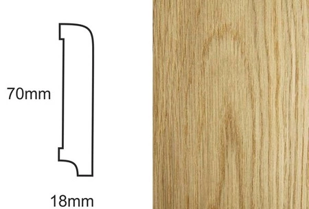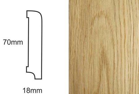 - Listwa przypodłogowa fornirowana, dąb, lakierowana, o wymiarach 70mm x 18mm x 2400mm, gotowa do montażu, z wykończeniem w połysku 30 Gloss.