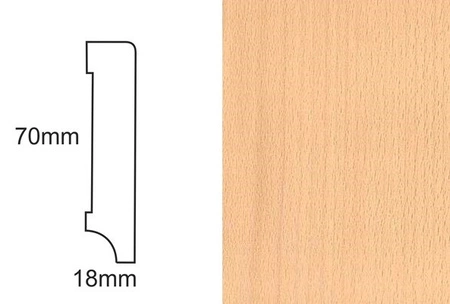 - Listwa przypodłogowa fornirowana, buk, lakierowana, o wymiarach 70mm x 18mm x 2400mm, gotowa do montażu, z wykończeniem w połysku 30 Gloss.