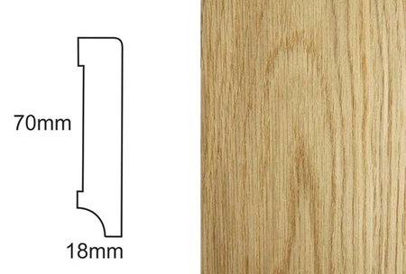 - Listwa przypodłogowa fornirowana, dąb, lakierowana, o wymiarach 70mm x 18mm x 2400mm, gotowa do montażu, z wykończeniem w połysku 30 Gloss.