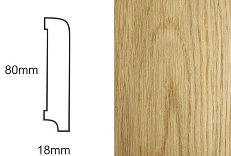 - Listwa przypodłogowa fornirowana, Dąb, lakierowana, o wymiarach 80mm x 18mm x 2400mm, gotowa do montażu, z wykończeniem w połysku 30 Gloss.