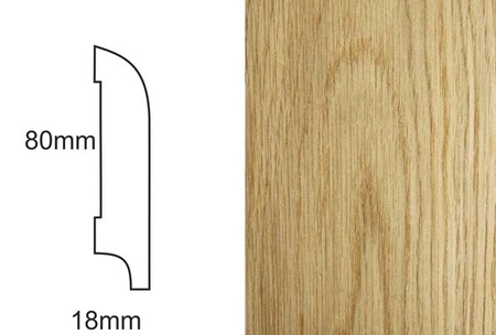 - Listwa przypodłogowa fornirowana, Dąb, lakierowana, o wymiarach 80mm x 18mm x 2400mm, gotowa do montażu, z wykończeniem w połysku 30 Gloss.