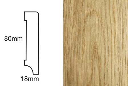- Listwa przypodłogowa fornirowana, dąb, lakierowana, o wymiarach 80mm x 18mm x 2400mm, gotowa do montażu, z wykończeniem w połysku 30 Gloss.