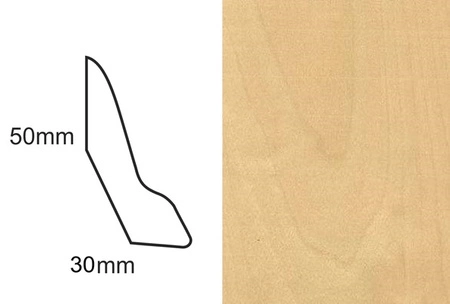 - Listwa przypodłogowa fornirowana, brzoza, lakierowana w połysku 30 Gloss, o wymiarach 50mm x 28mm x 2400mm, już gotowa do montażu.