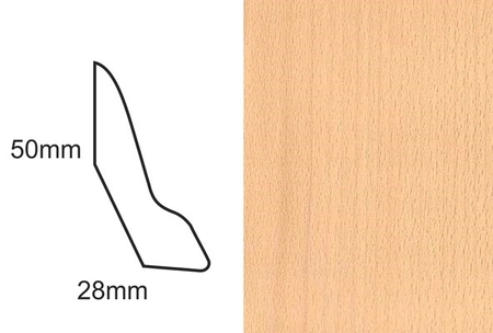 - Listwa przypodłogowa fornirowana, buk, lakierowana, o wymiarach 50mm x 30mm x 2400mm, gotowa do montażu, z wykończeniem w połysku 30 Gloss.