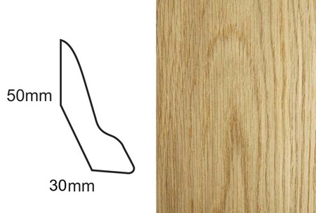 - Listwa przypodłogowa fornirowana, dąb, lakierowana, o wymiarach 50mm x 30mm x 2400mm, gotowa do montażu, z wykończeniem w połysku 30 Gloss.