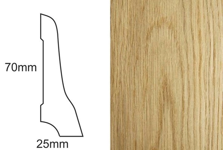 - Listwa przypodłogowa fornirowana, dąb, lakierowana, o wymiarach 70mm x 25mm x 2400mm, gotowa do montażu, z wykończeniem w połysku 30 Gloss.