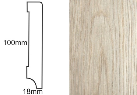 - Listwa przypodłogowa fornirowana, dąb, nielakierowana, o profilu CP100 R3 i wymiarach 100mm x 18mm x 2400mm, idealna do bejcowania, olejowania czy lakierowania.