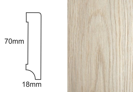 - Listwa przypodłogowa fornirowana, dąb, nielakierowana, o wymiarach 70mm x 18mm x 2400mm, idealna do bejcowania, olejowania czy lakierowania.