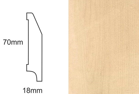 - Listwa przypodłogowa fornirowana, klon, nielakierowana o profilu CP70 RS i wymiarach 70mm x 18mm x 2400mm, idealna do bejcowania, olejowania czy lakierowania.