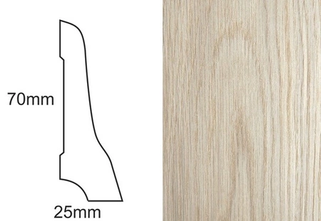 - Listwa przypodłogowa fornirowana, dąb, nielakierowana, o wymiarach 70mm x 25mm x 2400mm, idealna do bejcowania, olejowania czy lakierowania.