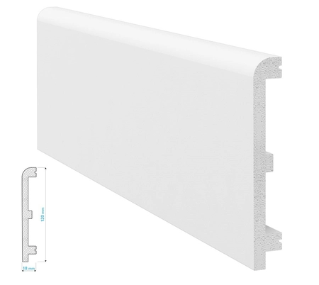Listwa przypodłogowa Krome P12018 120x18x2400 to doskonałe rozwiązanie dla osób ceniących eleganckie i funkcjonalne rozwiązania. Dzięki swojej wysokości, sprawdzi się zarówno w niewielkich, jak i wielometrażowych pomieszczeniach. Delikatnie zaokrąglona górna część listwy doda elegancji każdej aranżacji. Listwa idealnie zamaskuje kable czy nieestetyczne łączenia pomiędzy ścianą a podłogą.Specyfikacja techniczna