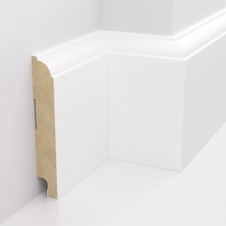 MDF (Medium Density Fiberboard) to płyta drewnopochodna o średniej gęstości, szeroko stosowana w produkcji listew przypodłogowych i dekoracyjnych. Łączy stabilność wymiarową z gładką powierzchnią, która ułatwia malowanie i wykończenie według indywidualnych potrzeb.