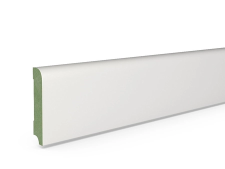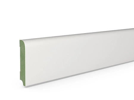 - Listwa przypodłogowa biała, wykonana z wilgocioodpornego MDF, o wymiarach 100mm x 18mm x 2440mm, pokryta lakierem półmatowym RAL 9003 o połysku 28 Gloss.