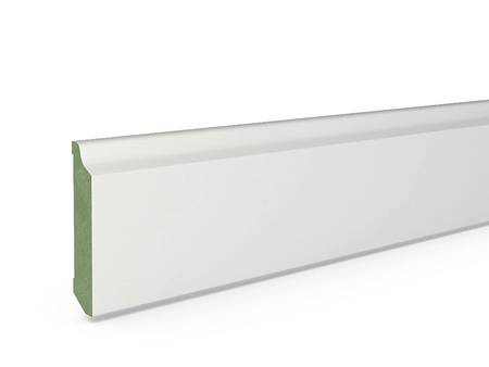 - Listwa przypodłogowa MDF Plus, biała, wzór F1, o wymiarach 80mm x 16mm x 2620mm, wilgocioodporna, z lakierem białym RAL 9003 o połysku 28 Gloss.