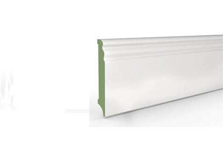 - Listwa przypodłogowa biała MDF PLUS, o wymiarach 100mm x 16mm x 2620mm, wilgocioodporna, z lakierem białym RAL 9003 o połysku 28 Gloss.