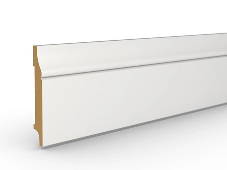 - Listwa przypodłogowa z MDF standard, lakierowana na biało, o wymiarach 80mm x 16mm x 2440mm, zabezpieczona przeciwwilgociowo, wykończona półmatowym lakierem 28 Gloss.