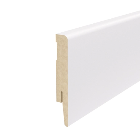 MDF (Medium Density Fiberboard) to płyta drewnopochodna o średniej gęstości, szeroko stosowana w produkcji listew przypodłogowych i dekoracyjnych. Łączy stabilność wymiarową z gładką powierzchnią, która ułatwia malowanie i wykończenie według indywidualnych potrzeb.