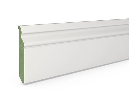 MDF (Medium Density Fiberboard) to płyta drewnopochodna o średniej gęstości, szeroko stosowana w produkcji listew przypodłogowych i dekoracyjnych. Łączy stabilność wymiarową z gładką powierzchnią, która ułatwia malowanie i wykończenie według indywidualnych potrzeb.