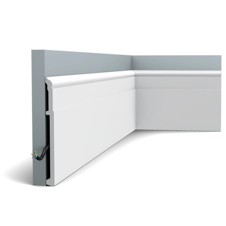 - Duża, prosta i gładka listwa przypodłogowa SX156 z poliuretanu, z fazą i praktyczną wnęką na kable.
