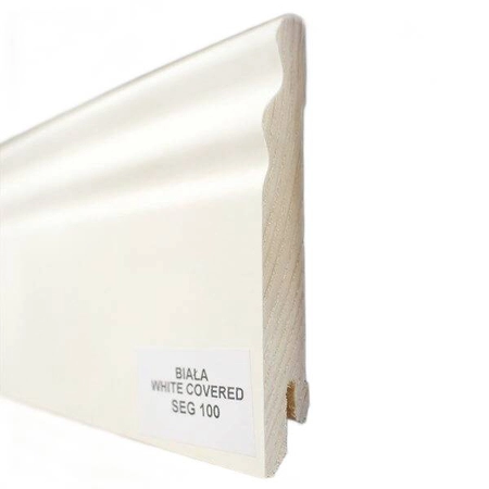 - Listwa przypodłogowa White Covered SEG100 z drewna naturalnego w kolorze białym RAL 9003 do wykończenia styku ściany z podłogą. Długość 240 cm, wymiary 1.4 × 9.5 cm, montaż na klipsy lub klej.