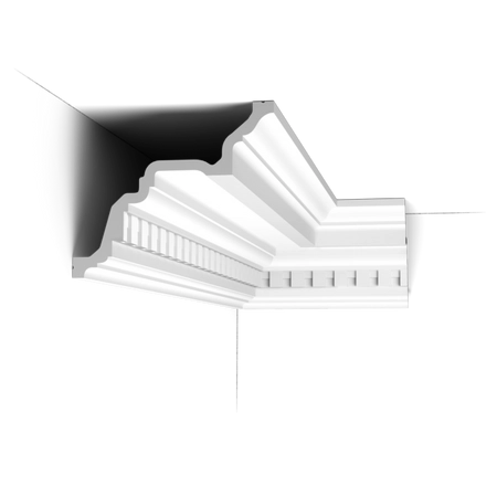 - Duży gzyms klasyczny C422 to stylowa sztukateria sufitowa, wyposażona w zabkowaną dekorację na dolnej krawędzi, idealna do podkreślenia eleganckiego charakteru wnętrza.