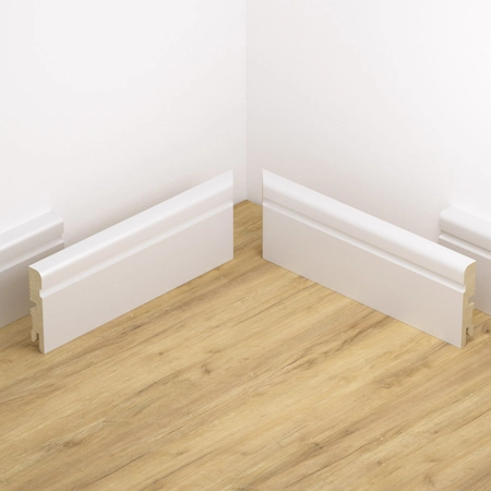 MDF (Medium Density Fiberboard) to płyta drewnopochodna o średniej gęstości, szeroko stosowana w produkcji listew przypodłogowych i dekoracyjnych. Łączy stabilność wymiarową z gładką powierzchnią, która ułatwia malowanie i wykończenie według indywidualnych potrzeb.